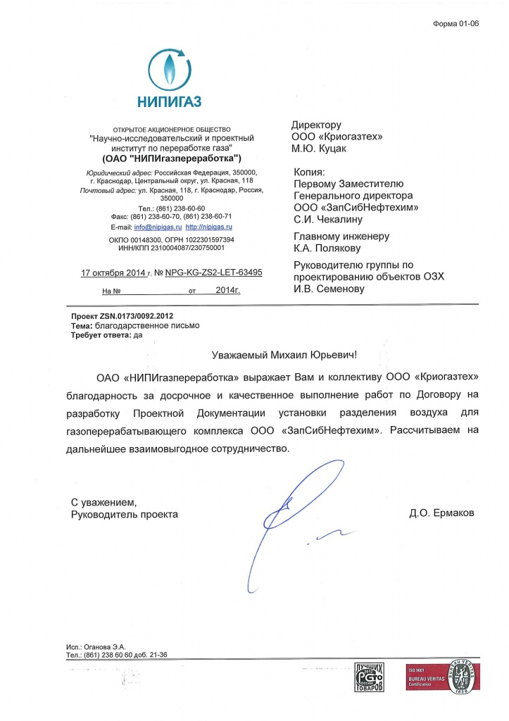 Разработка проектной документации установки разделения воздуха для газоперерабатывающего комплекса ООО «ЗапСибНефтехим»